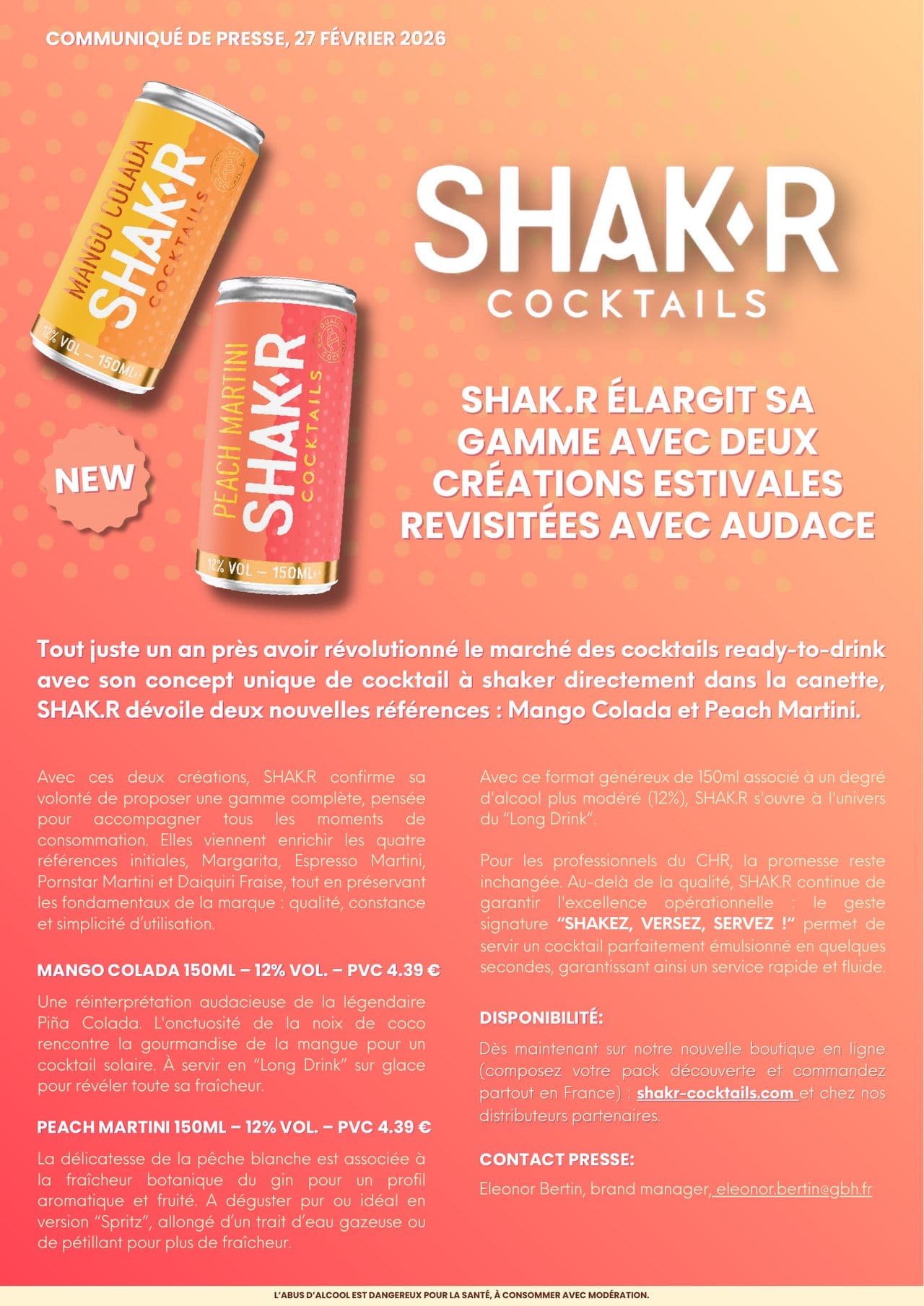 Tout juste un an après avoir révolutionné le marché des cocktails ready-to-drink avec son concept unique de cocktail à shaker directement dans la canette, SHAK.R dévoile deux nouvelles références : Mango Colada et Peach Martini.