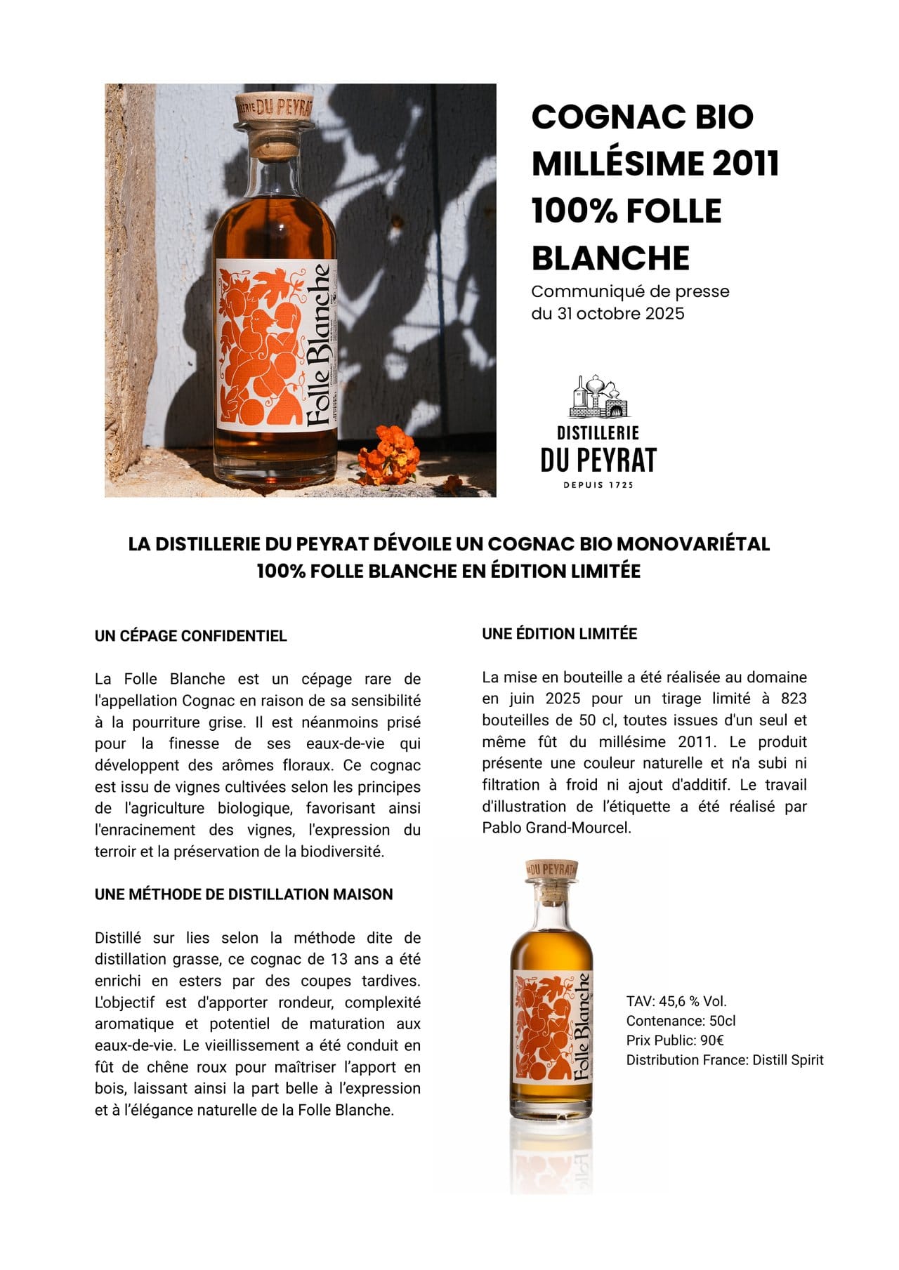 La Folle Blanche est un cépage rare de l'appellation Cognac en raison de sa sensibilité à la pourriture grise. Il est néanmoins prisé pour la finesse de ses eaux-de-vie qui développent des arômes floraux. Ce cognac est issu de vignes cultivées selon les principes de l'agriculture biologique, favorisant ainsi l'enracinement des vignes, l'expression du terroir et la préservation de la biodiversité.