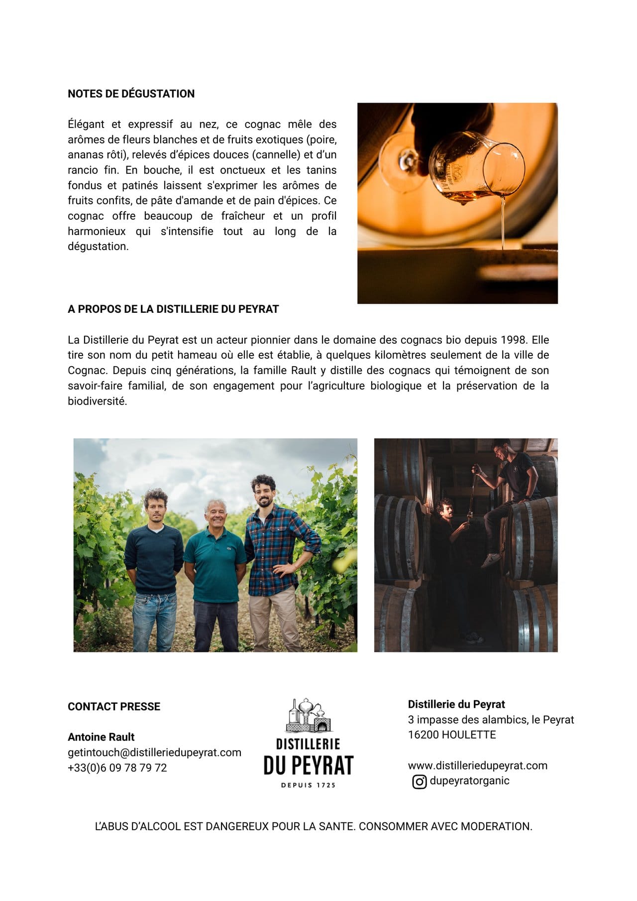 La Distillerie du Peyrat est un acteur pionnier dans le domaine des cognacs bio depuis 1998. Elle tire son nom du petit hameau où elle est établie, à quelques kilomètres seulement de la ville de Cognac. Depuis cinq générations, la famille Rault y distille des cognacs qui témoignent de son savoir-faire familial, de son engagement pour l'agriculture biologique et la préservation de la biodiversité.