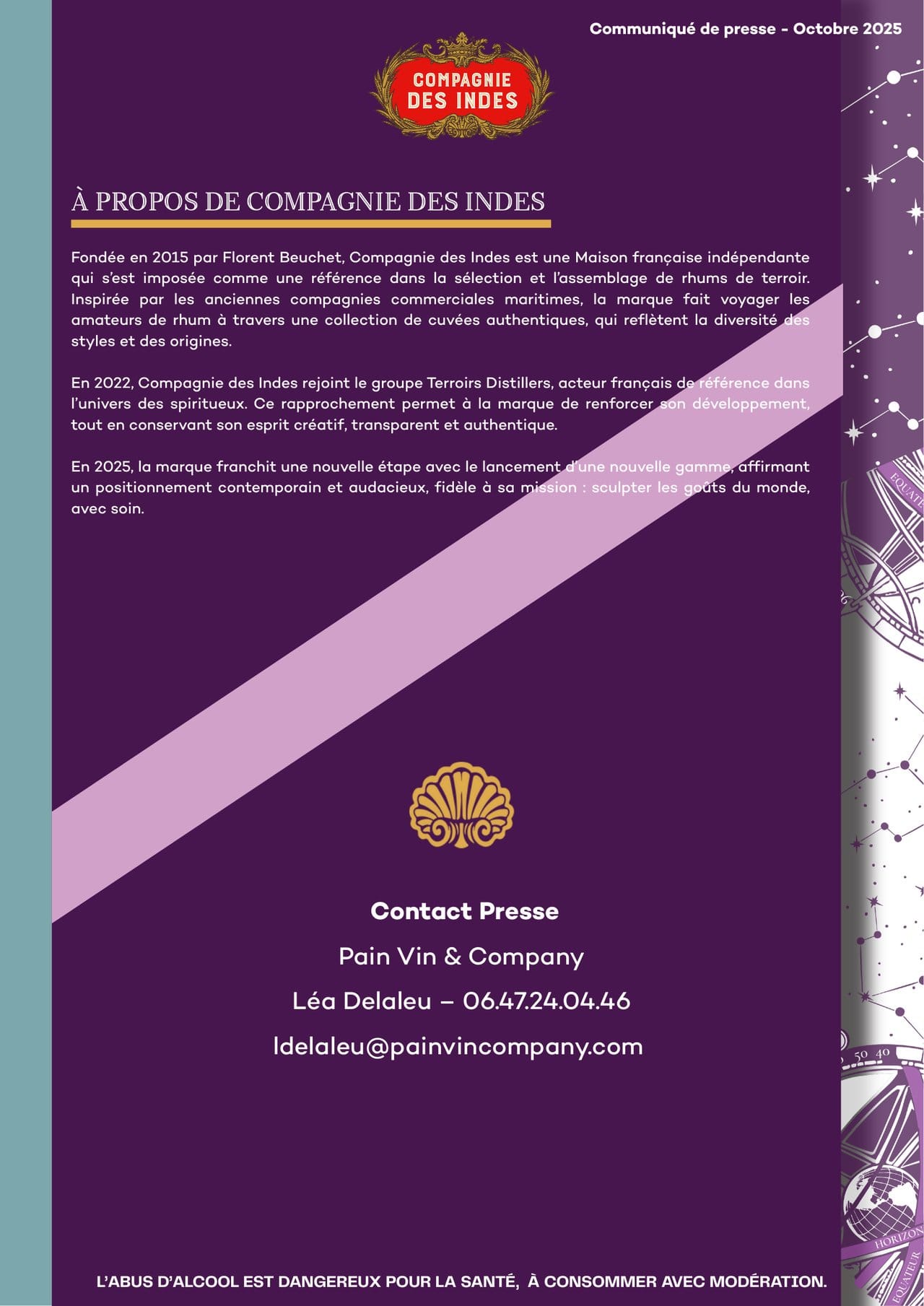 À l'occasion de son 10ᵉ anniversaire, Compagnie des Indes signe une nouvelle page de son histoire. Fondée en 2015 par Florent Beuchet, la Maison s'est imposée comme une référence incontournable dans l'univers du rhum de terroir. Fidèle à son esprit d'exploration, la Maison met à l'honneur la richesse des terroirs et le savoir-faire des producteurs à travers des assemblages précis, singuliers et expressifs. En 2025, la marque inaugure un relancement global : une identité visuelle revisitée, un nouveau cœur de gamme repensé autour de cinq références emblématiques et une volonté affirmée de faire voyager les amateurs à travers les terroirs du monde. À côté de ce cœur de gamme, des éditions limitées viennent prolonger cette invitation au voyage, en révélant toute la diversité et la rareté des rhums d'exception. Fidèle à sa mission, Compagnie des Indes poursuit sa quête : sculpter les goûts du monde, avec soin.