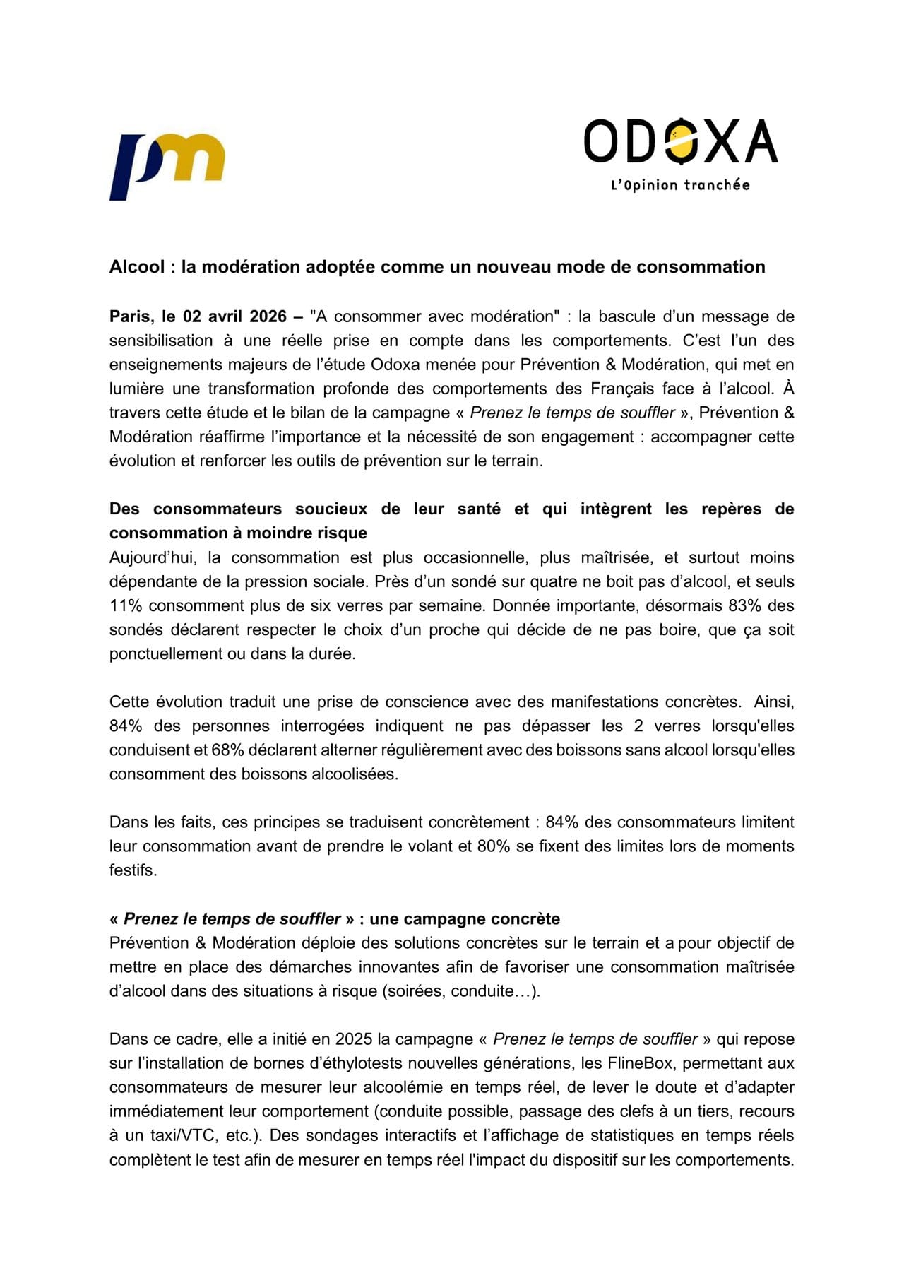 La bascule d'un message de sensibilisation à une réelle prise en compte dans les comportements. C'est l'un des enseignements majeurs de l'étude Odoxa menée pour Prévention & Modération, qui met en lumière une transformation profonde des comportements des Français face à l'alcool.