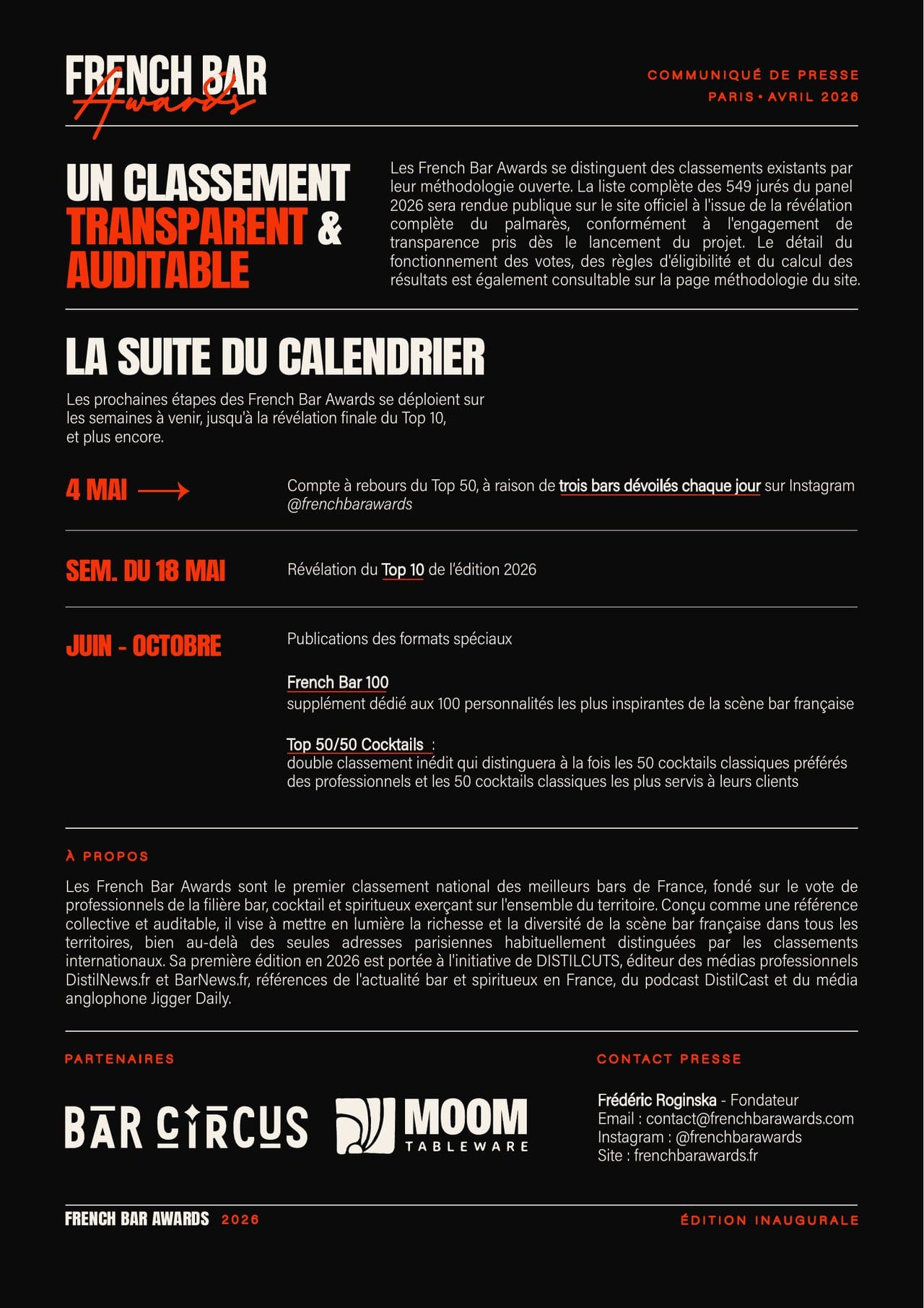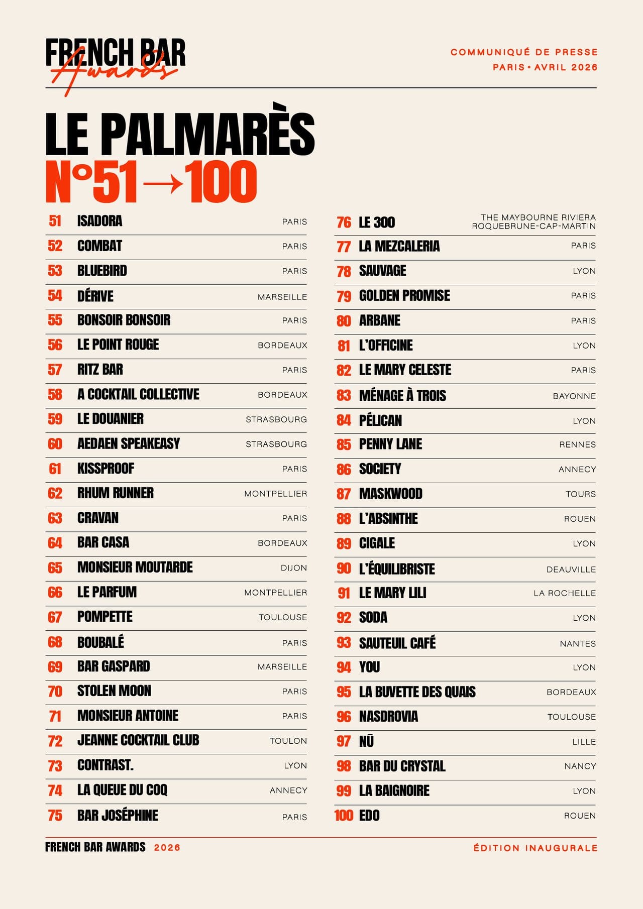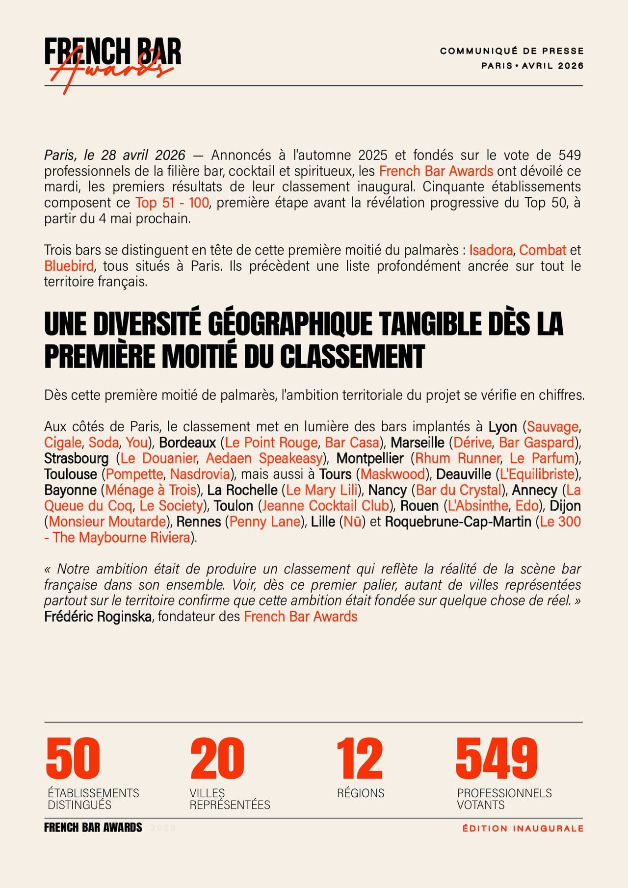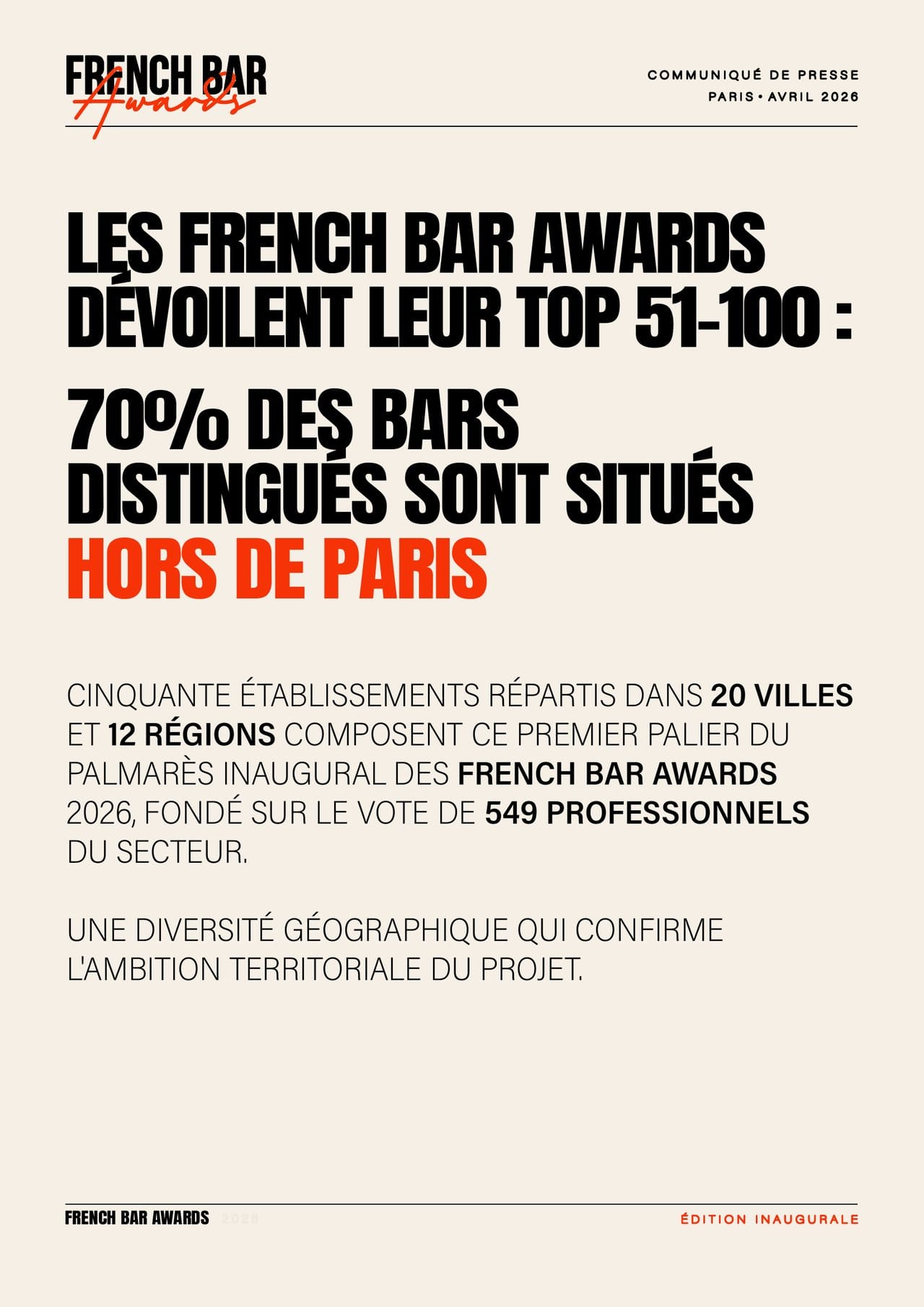 Cinquante établissements répartis dans 20 villes et 12 régions composent ce premier palier du palmarès inaugural des French Bar Awards 2026, fondé sur le vote de 549 professionnels du secteur. Une diversité géographique qui confirme l'ambition territoriale du projet.