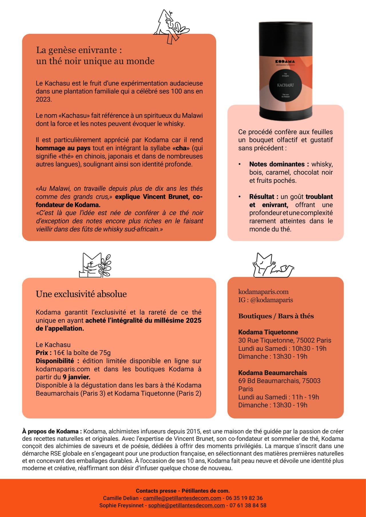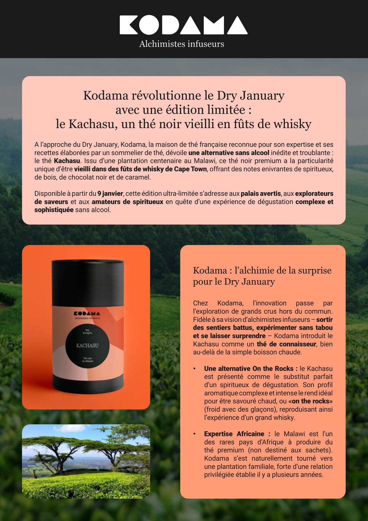 À l'approche du Dry January, Kodama, la maison de thé française reconnue pour son expertise et ses recettes élaborées par un sommelier de thé, dévoile une alternative sans alcool inédite et troublante : le thé Kachasu. Issu d'une plantation centenaire au Malawi, ce thé noir premium a la particularité unique d'être vieilli dans des fûts de whisky de Cape Town, offrant des notes enivrantes de spiritueux, de bois, de chocolat noir et de caramel.