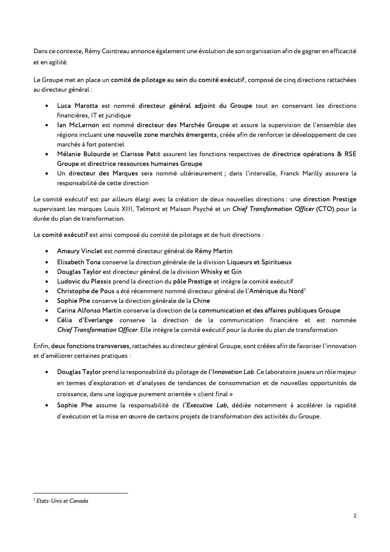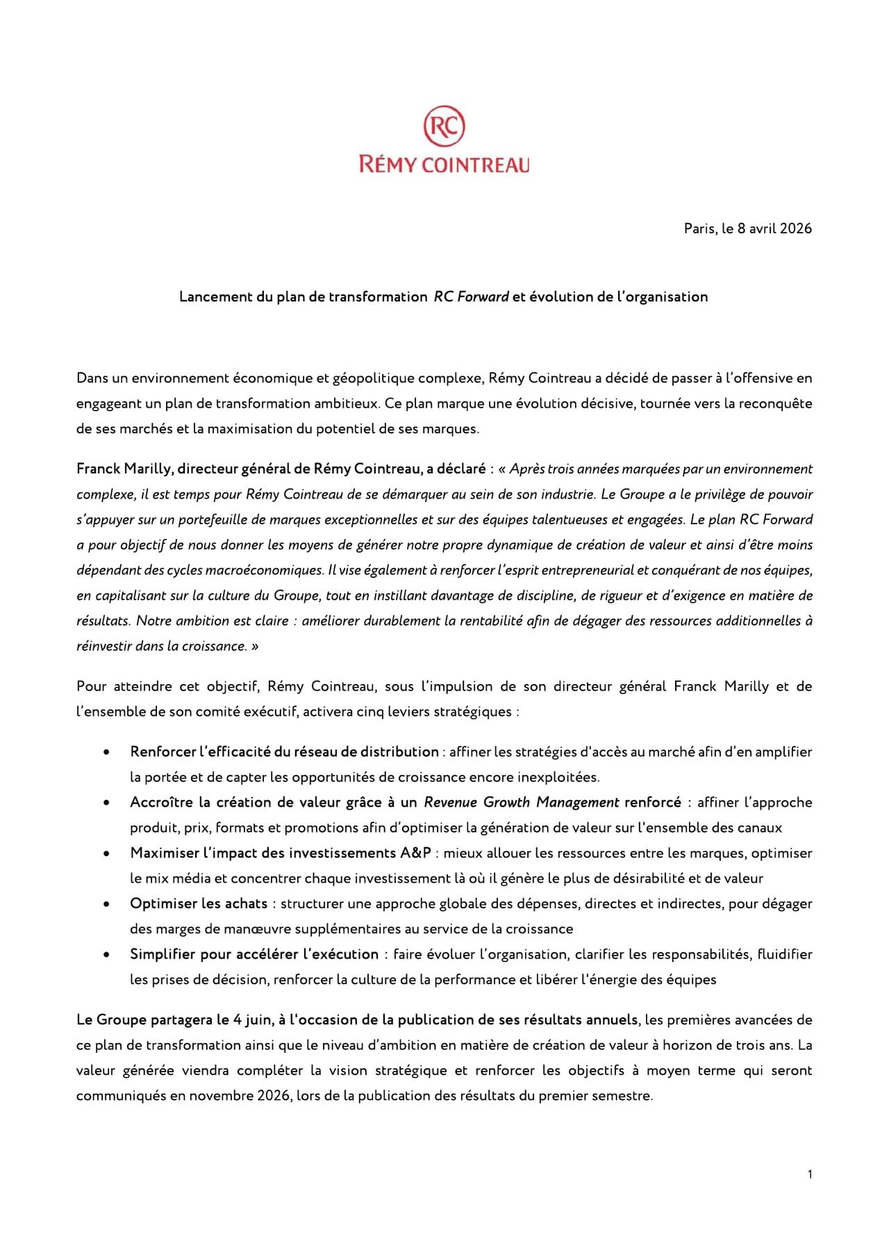 Rémy Cointreau : lancement du plan de transformation RC Forward et évolution de l'organisation