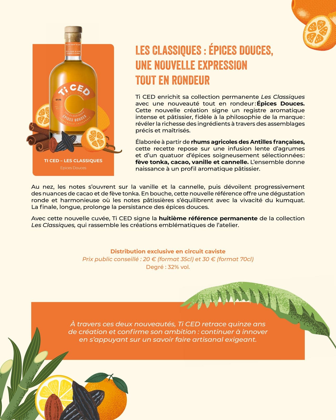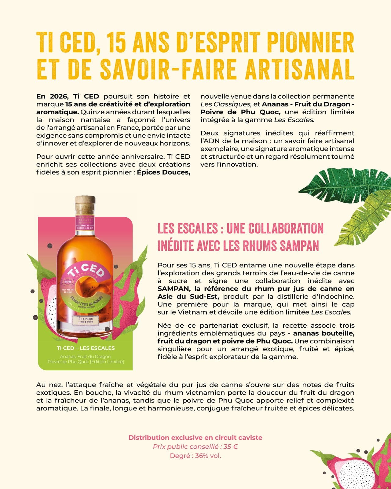 En 2026, Ti CED poursuit son histoire et marque 15 ans de créativité et d'exploration aromatique. Pour ouvrir cette année anniversaire, la marque enrichit ses collections avec deux créations fidèles à son esprit pionnier : Épices Douces, et Ananas - Fruit du Dragon - Poivre de Phu Quoc.