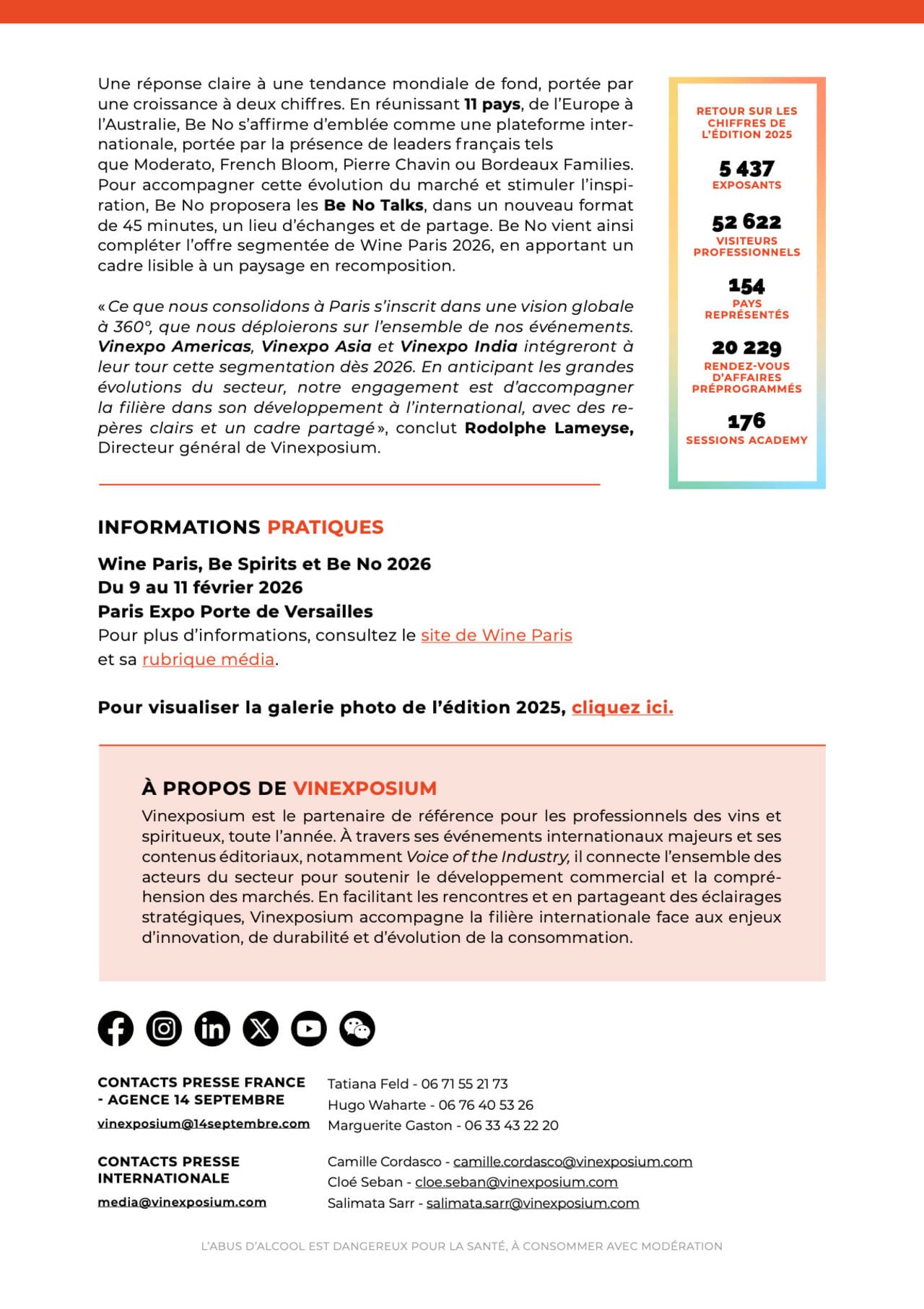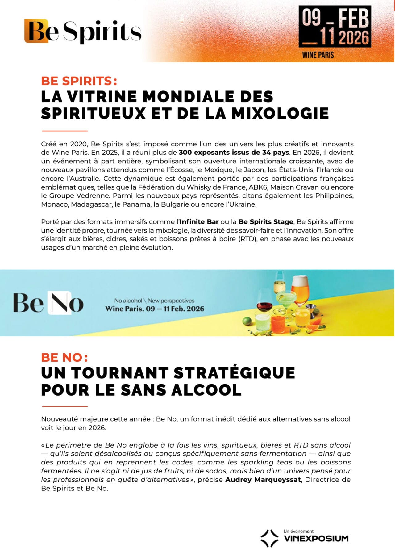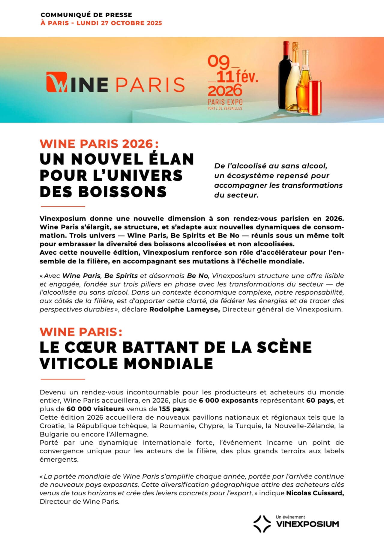 Wine Paris s'élargit, se structure, et s'adapte aux nouvelles dynamiques de consommation. Trois univers — Wine Paris, Be Spirits et Be No — réunis sous un même toit pour embrasser la diversité des boissons alcoolisées et non alcoolisées.